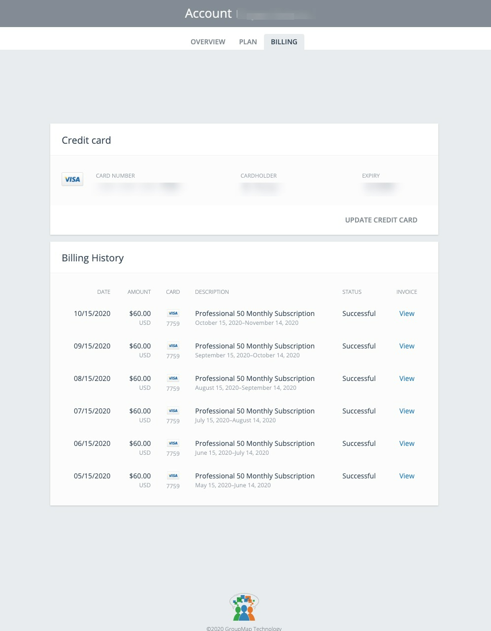 - Under BILLING, select UPDATE CREDIT CARD. From here you will be able to update the card details associated with your GroupMap account.